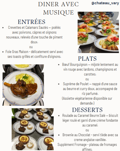 Au Château Vary, notre table d’hôtes célèbre la richesse du terroir dans un esprit de convivialité et d’authenticité. Une cuisine maison, élaborée à partir de produits locaux et de saison, accompagne vos temps forts avec générosité et raffinement. Déjeuner entre deux réunions ou dîner de clôture : chaque repas devient un moment de partage privilégié, propice aux échanges dans une atmosphère chaleureuse et détendue.
